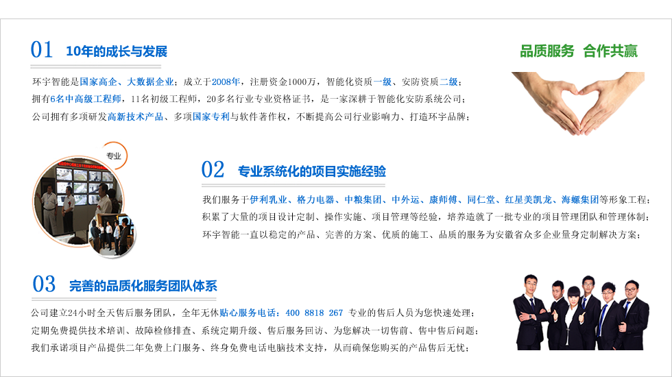 合肥市環(huán)宇智能工程有限公司成立于2008年科創(chuàng)版上市企業(yè),現(xiàn)注冊(cè)資金1000萬(wàn)整,電子與智能化系統(tǒng)集成資質(zhì)壹級(jí),安防資質(zhì)級(jí),是“國(guó)家高新技術(shù)企業(yè)”、“合肥市高新技術(shù)產(chǎn)品認(rèn)定企業(yè)”、“安徽省安防協(xié)會(huì)會(huì)員單位”、“AAA級(jí)信用等級(jí)認(rèn)證企業(yè)”、“AAA級(jí)重合同守信用企業(yè)”、“合肥市創(chuàng)新型企業(yè)”、是行業(yè)領(lǐng)先的智能化整體解決方案的集成商